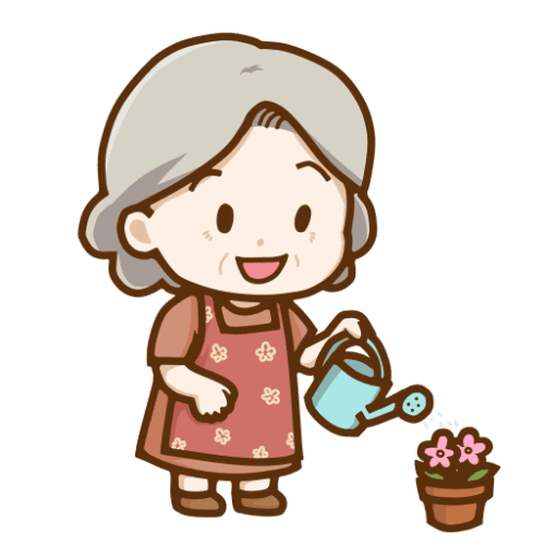 花柄のエプロンを着て、笑顔で鉢植えのお花に水やりをしているおばあさんのイラストです。親しみやすい3頭身の可愛らしいタッチで仕上げました。